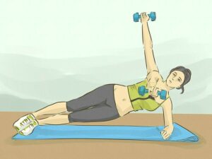 - Pare na posição de prancha lateral: apoie-se no chão sobre o cotovelo direito, de modo que ele fique logo abaixo do ombro, e sobre o pé direito, com o pé esquerdo por cima deste.